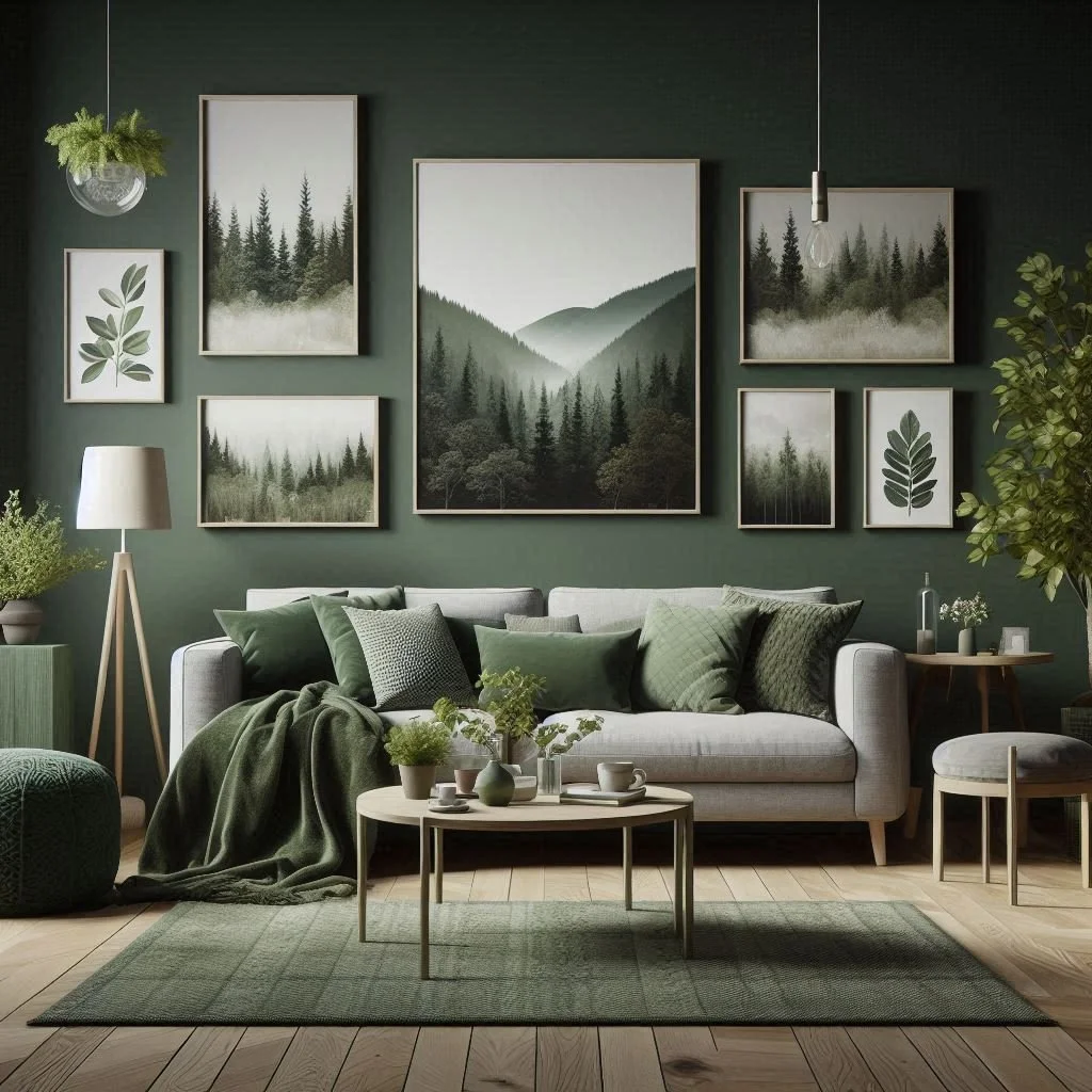 Earthy tones like beige, brown, and terracotta complement forest green and dark green beautifully, creating a warm and inviting atmosphere.