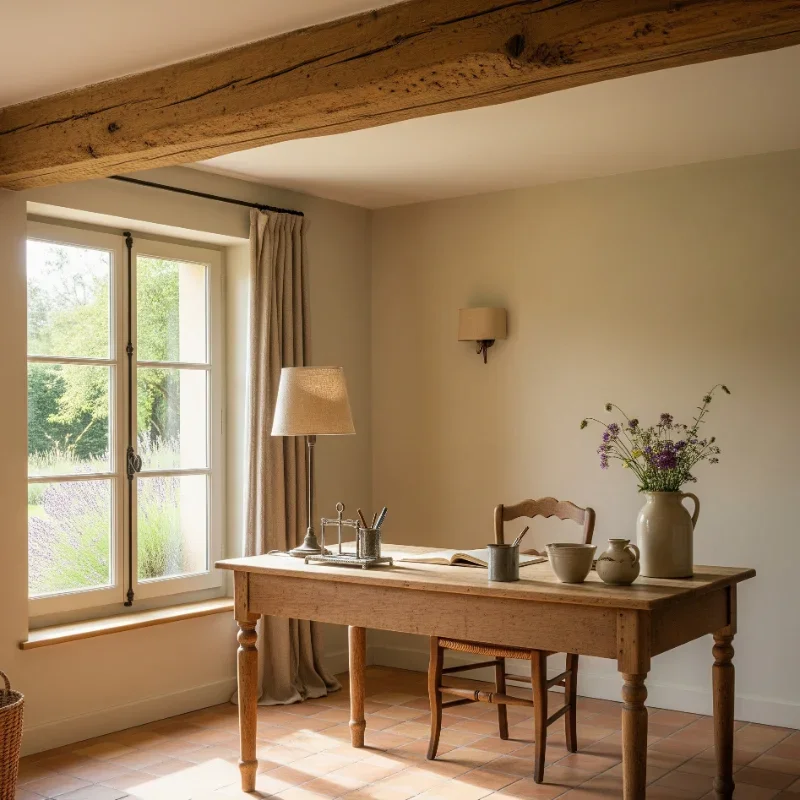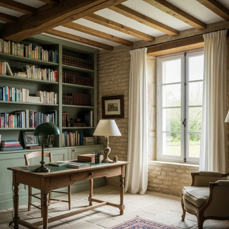 Create instant architectural interest by exposing ceiling beams or adding faux versions for that authentic French farmhouse feel. These structural elements draw eyes upward, making spaces feel larger and more dynamic. Natural wood beams add warmth and texture that painted ceilings can't match. In rooms without existing beams, lightweight polyurethane versions install easily and look remarkably authentic. Stain beams to complement your furniture or leave them natural for rustic appeal. The horizontal lines create visual rhythm that energizes your workspace. Beams also provide perfect mounting points for pendant lights or hanging plants. Paint the ceiling between beams white to maximize brightness and contrast. This architectural feature transforms ordinary rooms into extraordinary offices. Your workspace gains the character typically reserved for centuries-old French cottages.