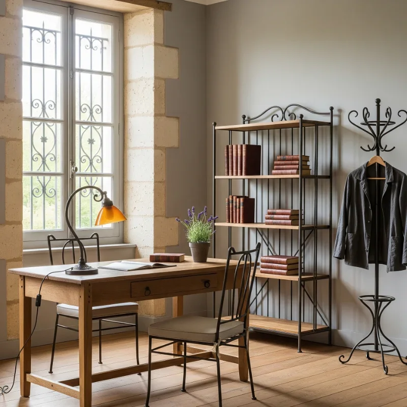 Incorporate wrought iron elements that add French country authenticity through their delicate curves and handcrafted appeal. These details appear in curtain rods, wall sconces, desk accessories, and decorative brackets. The dark metal provides striking contrast against light walls and furniture. Choose pieces with scrollwork and botanical motifs that echo garden gates and balconies. Iron bookends keep reference materials organized while adding sculptural interest. Wall-mounted iron shelves offer display space without visual weight. The material's durability ensures these accents last through office redesigns. Mix iron with other metals like brass or copper for collected-over-time appeal. Small iron accessories like letter holders or pen cups bring the theme to desktop level. Your workspace gains architectural jewelry that elevates ordinary functions to artistic expressions.