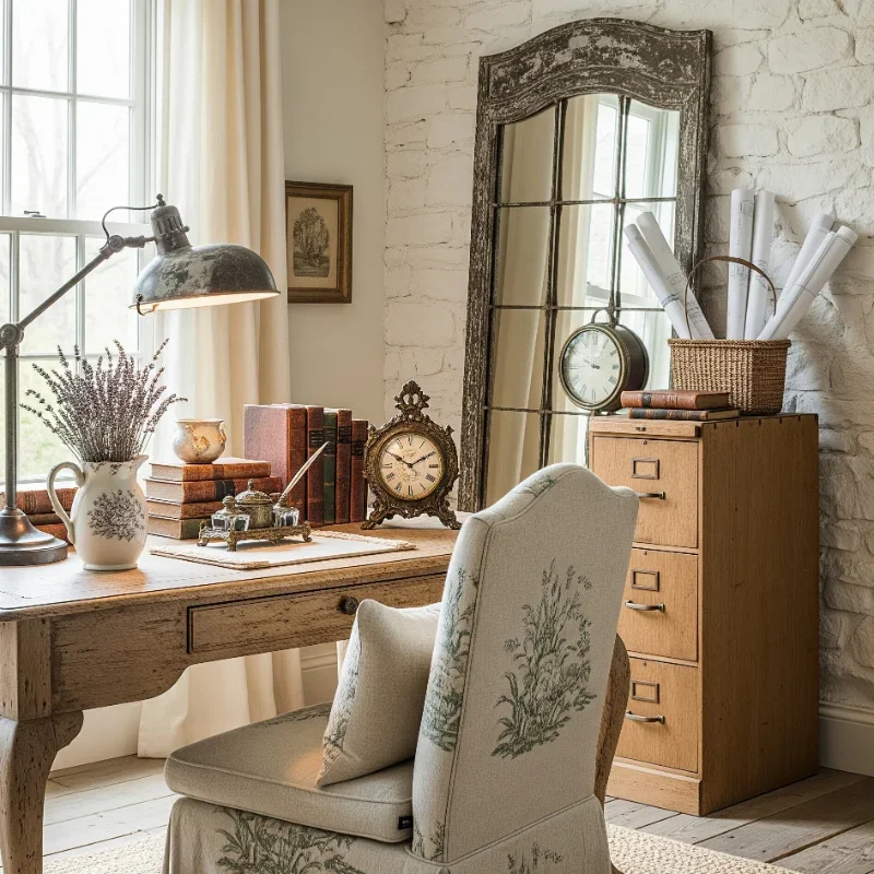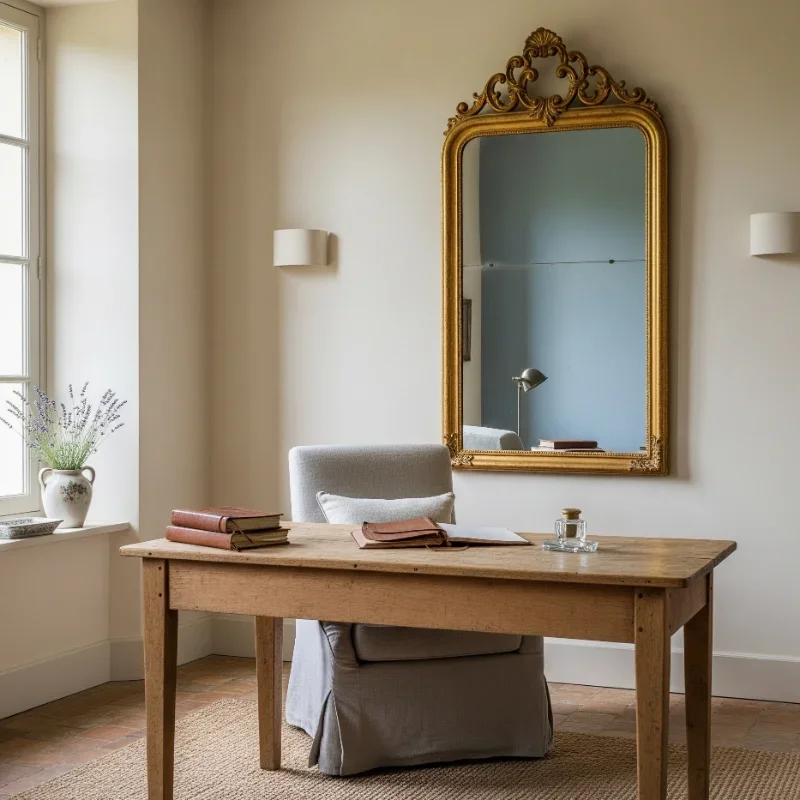Strategic mirror placement doubles your office's visual space while adding decorative punch through ornate frames. French country mirrors feature carved details, distressed gilding, or painted finishes that serve as wall art. Position a large mirror opposite windows to maximize natural light throughout your workspace. Smaller mirrors grouped together create gallery walls with reflective benefits. Antique mirrors with age spots and clouding add authentic character modern versions lack. The ornate frames provide texture and interest even when you're not checking your appearance. Mirrors help combat the closed-in feeling small offices can create. Choose frames that complement your furniture's finish for cohesive design. Lean large floor mirrors against walls for flexibility and dramatic impact. Your office gains depth and brightness that makes long work hours more pleasant.