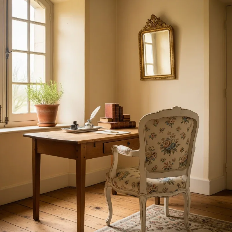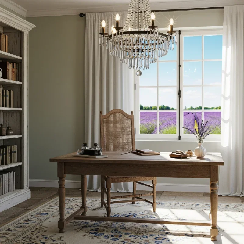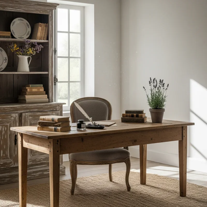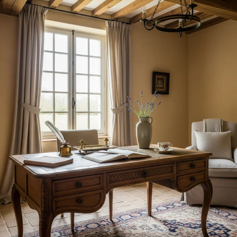 Nothing anchors a French country office quite like an authentic antique writing desk that whispers stories of the past. These timeless pieces, with their curved legs and distressed finishes, become the star of your workspace. Hunt for desks featuring delicate carvings, brass hardware, and multiple drawers for modern storage needs. The beauty lies in imperfections: water rings, scratches, and worn edges add character you can't fake. Position your desk near a window to enjoy natural light while you work. Many antique desks include secret compartments perfect for storing important documents or treasured keepsakes. Don't worry about matching everything perfectly; French country style celebrates the collected-over-time look. Your computer and modern accessories blend surprisingly well with antique charm. The investment in a quality piece pays dividends in both functionality and daily inspiration. Every workday begins with a touch of European elegance.