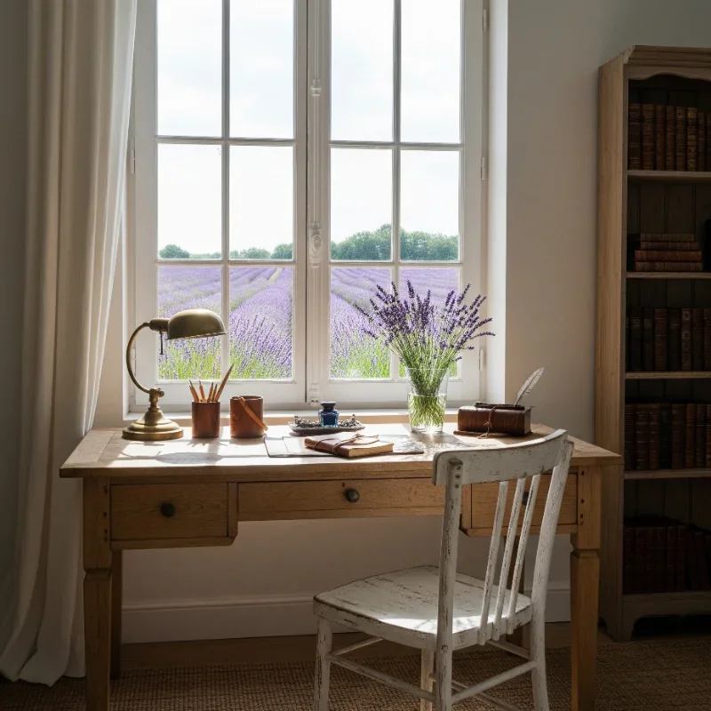 Infuse your workspace with the essence of French countryside through strategic lavender placement and purple accents. Fresh or dried lavender bundles provide natural fragrance that promotes calm focus during stressful projects. Display lavender in vintage glass bottles or tie bundles with twine for authentic presentation. The scent triggers relaxation without overwhelming sensitive noses or video call participants. Incorporate lavender hues through throw pillows, artwork, or desk accessories for visual continuity. Small potted lavender plants thrive on sunny windowsills, offering living reminders of Provence. The herb's natural pest-repelling properties provide practical benefits beyond aesthetics. Press lavender between books for subtle scenting of your library. Use lavender essential oil in diffusers for consistent fragrance without maintenance. Your office gains sensory richness that enhances well-being while maintaining professional appropriateness.