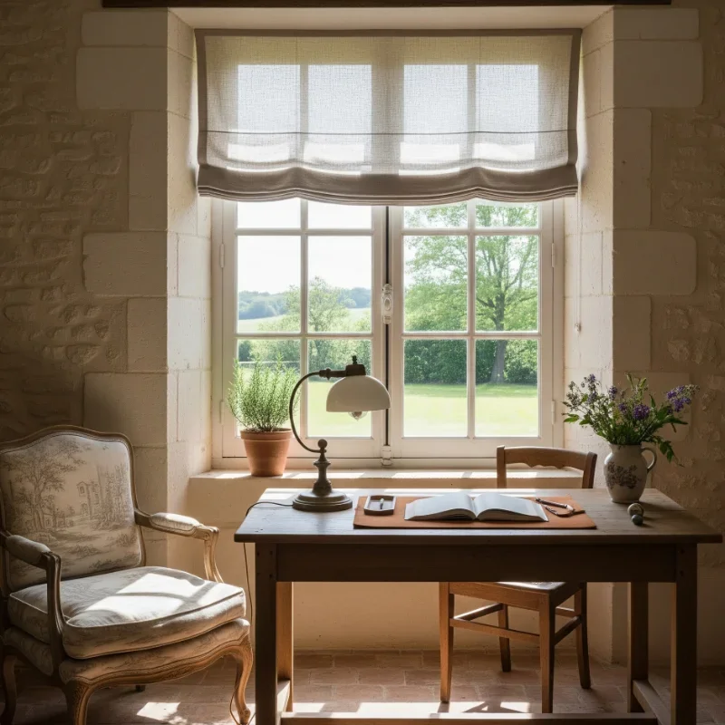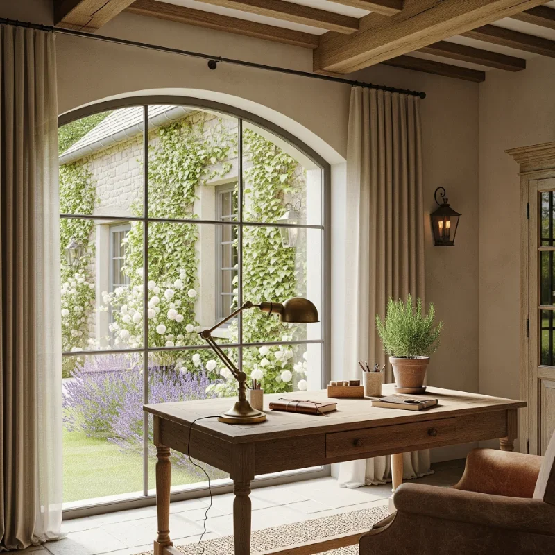 Dress your windows in flowing linen curtains that filter light while maintaining privacy during important video calls. Natural linen embodies French country style with its relaxed elegance and subtle texture. Choose cream, white, or soft gray tones that complement your color scheme without competing for attention. The fabric's inherent wrinkles add to its charm, eliminating pressure for perfection. Layer sheers with heavier linen panels for adjustable light control throughout the day. Linen's breathability helps regulate temperature, keeping your office comfortable year-round. Mount curtains high and wide to maximize natural light and create the illusion of larger windows. The soft movement of linen in a breeze adds life to static workspaces. Tie-backs in coordinating fabrics or simple rope keep curtains elegantly swept aside. Your windows become softly framed vignettes that enhance rather than distract from work.