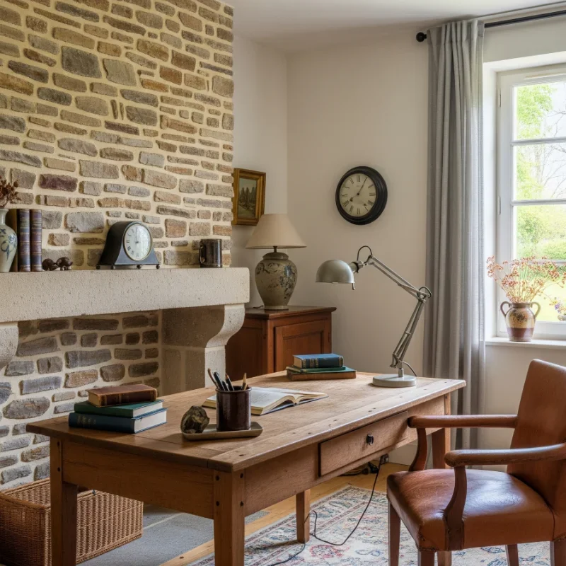 Ground your French country office with natural stone elements that connect indoor spaces to outdoor landscapes. A limestone desk accessory tray or marble pen holder brings authentic French materials to your fingertips. Stone bookends provide weight and beauty while organizing your professional library. Consider a small stone sculpture or carved bowl for desk styling. The cool touch and natural variations in stone offer tactile interest during thinking moments. Stone coasters protect wooden surfaces while maintaining aesthetic coherence. These elements add visual weight that anchors lighter furnishings and fabrics. Choose stones in neutral tones that complement your color palette. The durability of stone means these pieces become longtime workspace companions. Your office gains elemental beauty that balances technology's synthetic nature with earth's timeless materials.