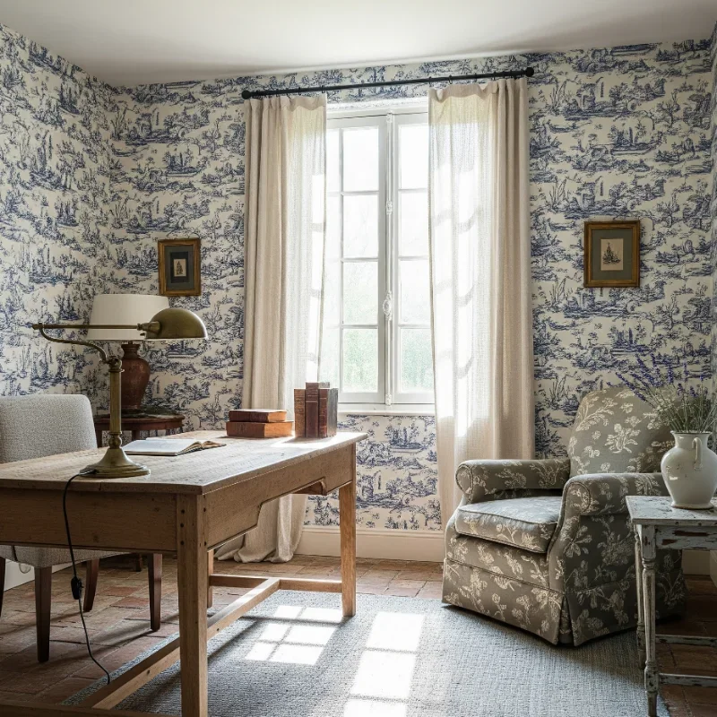 Transform blank walls into storytelling canvases with traditional toile de Jouy wallpaper that brings pastoral scenes to life. This quintessentially French pattern features delicate drawings of countryside vignettes, romantic couples, and bucolic landscapes. Choose classic blue and white for authenticity, or explore modern interpretations in soft grays or muted greens. The key is selecting scenes that inspire rather than distract during work hours. Apply toile to a single accent wall behind your desk for maximum impact without overwhelming the space. The pattern's intricate details provide visual interest during thinking breaks without being too busy. Modern printing techniques make today's toile wallpapers more durable and easier to install than vintage versions. Pair with solid fabrics and simple furniture to let the wallpaper shine. Your office becomes a sophisticated salon where creativity flows naturally. This single design choice sets the entire French country mood.