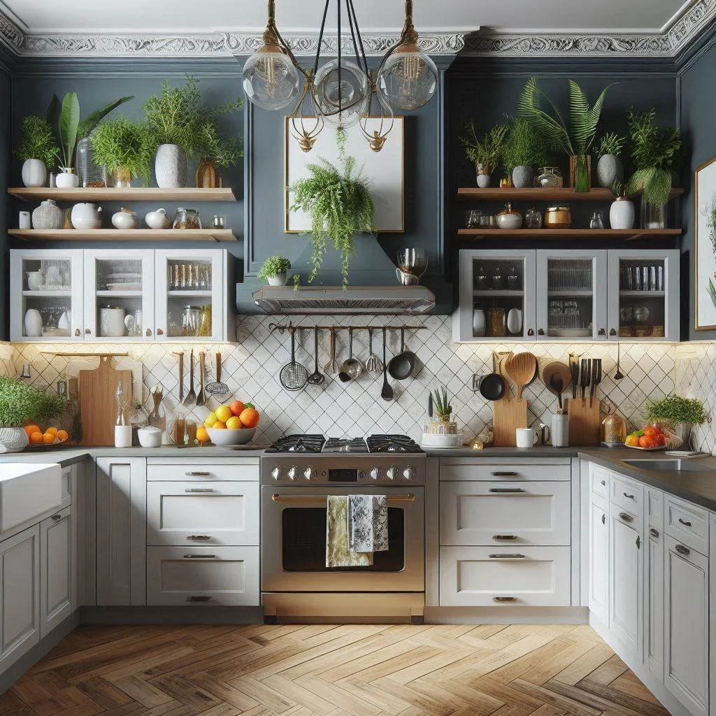Open shelves make the kitchen feel lighter and more open, but balance them with closed cabinets to avoid clutter.