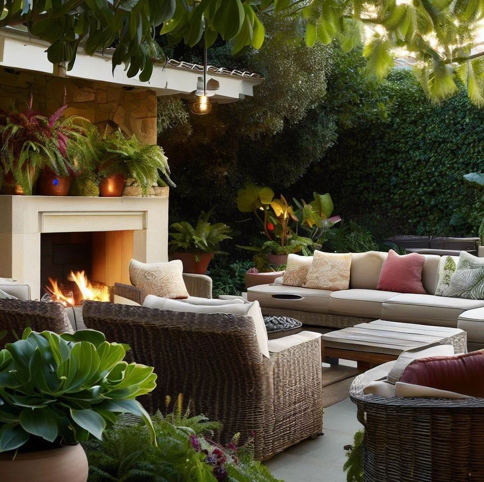 An inviting outdoor living space with comfortable seating, a fireplace, and lush plantings, blurring the lines between indoors and outdoors and exemplifying the concept of creating outdoor living spaces.