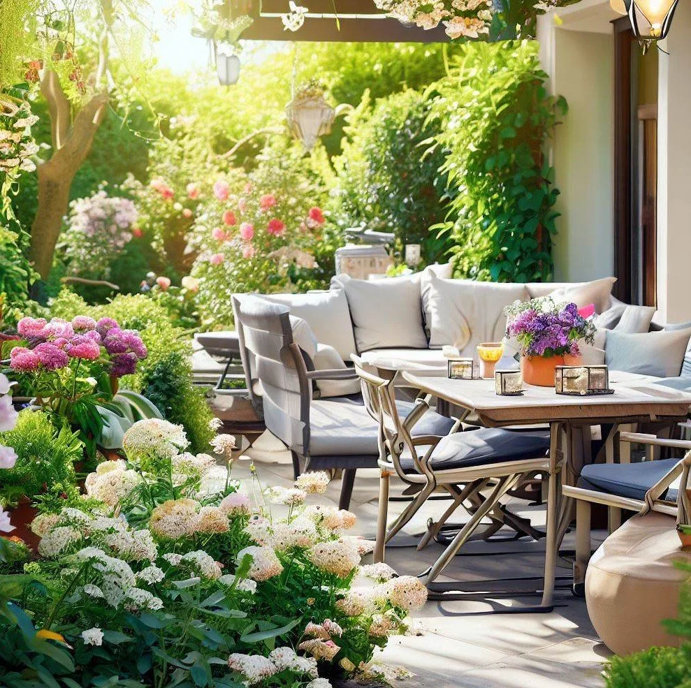 A garden patio adorned with comfortable outdoor furniture and a dining area surrounded by blooming plants, showcasing the combination of functionality and beauty in garden design.
