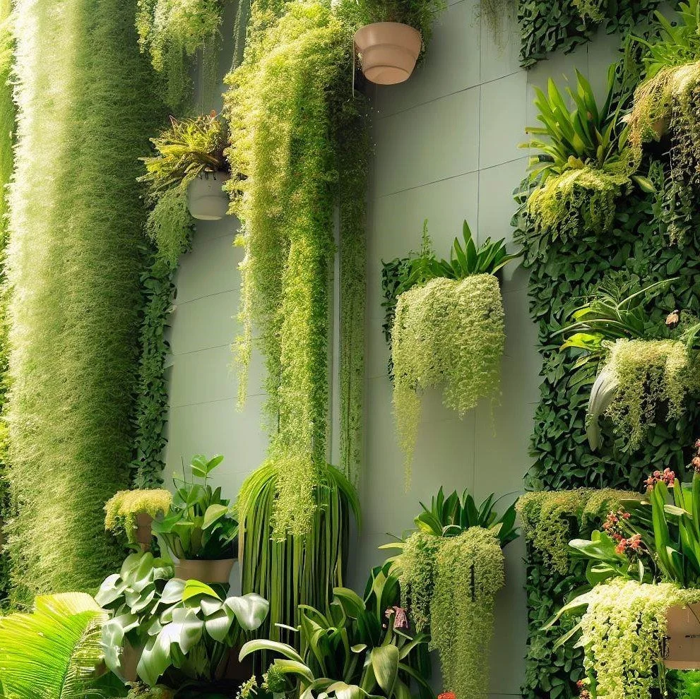 A vertical garden with cascading plants and hanging planters, showcasing the technique of vertical gardening in maximizing space and adding height to the garden.