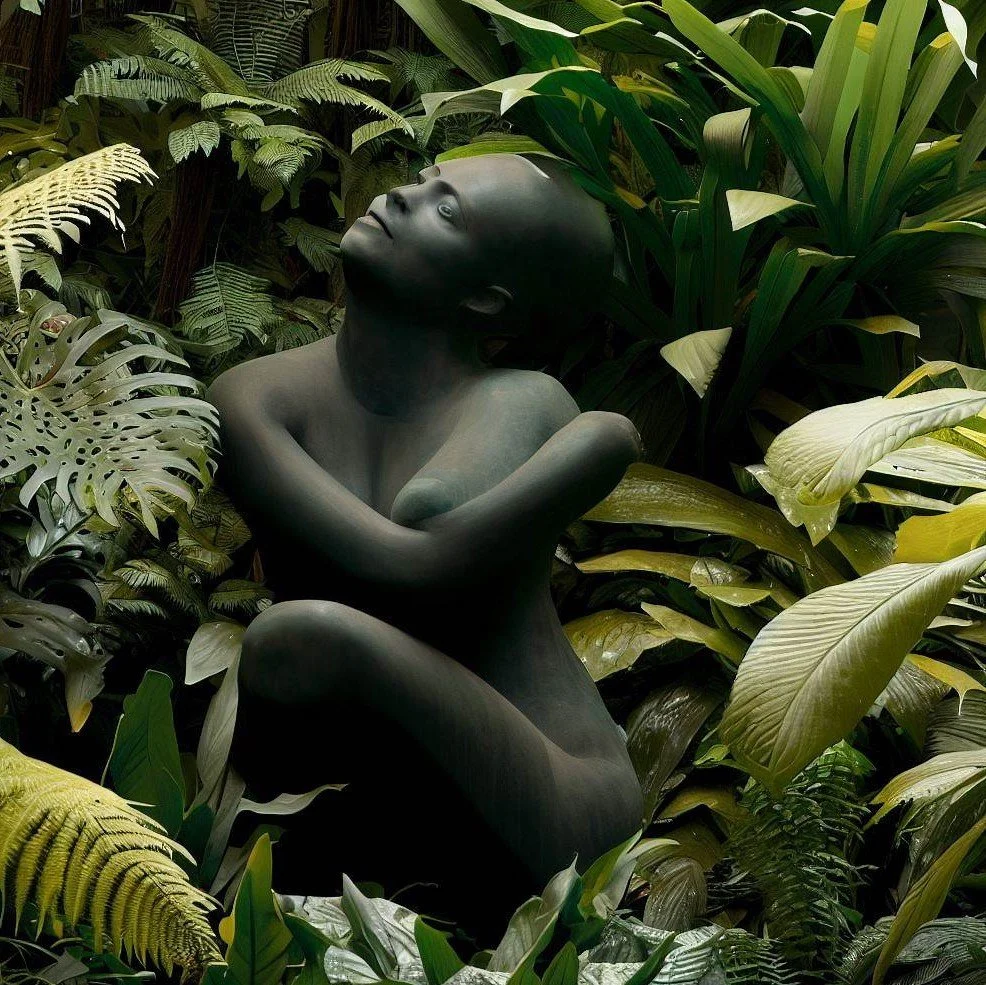 A captivating sculpture nestled among lush foliage, serving as a focal point and creating visual interest and depth in the garden.