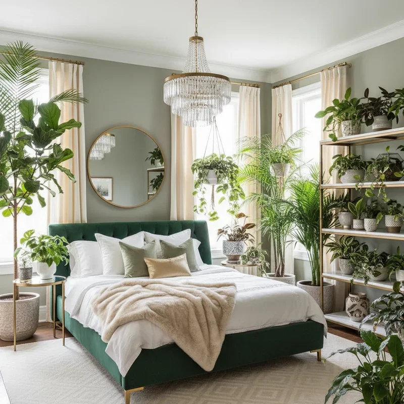 Fill your tropical bedroom with living plants that purify air while reinforcing the paradise theme. Position large statement plants like fiddle leaf figs, bird of paradise, or indoor palms in corners to create green architectural elements. Layer different heights using plant stands, hanging planters, and shelf displays for jungle-like abundance. Choose low-maintenance tropical plants like pothos, snake plants, or ZZ plants if you lack a green thumb. Group plants with similar water needs together for easier care routines. Include flowering plants like orchids or bromeliads for color pops among green foliage. The combination of various leaf shapes, sizes, and shades of green creates visual interest while improving room air quality. This living decor connects your indoor space with nature, essential for authentic tropical atmosphere that changes subtly with growth and seasons.