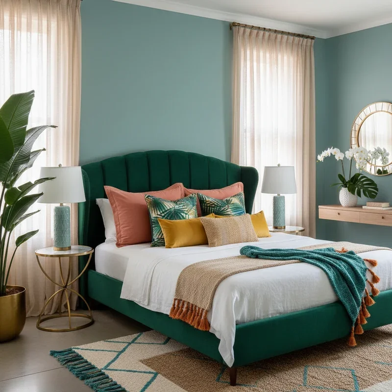 Build your tropical bedroom around a color palette inspired by paradise destinations: turquoise waters, coral sunsets, palm green, and sandy neutrals. Start with a neutral base of white or cream walls, then layer in tropical hues through bedding, artwork, and accessories. Consider the 60-30-10 rule: 60% neutral base, 30% secondary tropical color, and 10% vibrant accent shade for balanced design. Incorporate colors found in tropical fruits like mango orange, papaya coral, or lime green for playful touches. Don't shy away from bold combinations like navy and coral or emerald and gold that capture tropical drama. Use color temperature strategically: cool blues and greens for tranquility, warm corals and yellows for energy. Remember that tropical doesn't always mean bright; muted tropical tones create sophisticated island elegance suitable for adult bedrooms while maintaining that vacation feel.