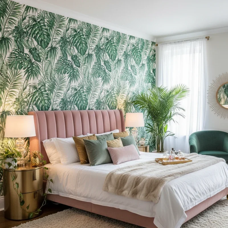 Transform your bedroom walls into a lush tropical jungle with bold botanical wallpaper featuring oversized palm fronds, banana leaves, or monstera patterns. Choose between realistic photographic prints for dramatic impact or stylized artistic interpretations for subtle sophistication. Apply wallpaper to a single accent wall behind your bed to avoid overwhelming the space, or go bold with all four walls for complete immersion. Consider removable wallpaper options if you're renting or want flexibility to change designs seasonally. Mix scales by combining large leaf patterns with smaller tropical florals like hibiscus or bird of paradise for visual interest. The key lies in selecting colors that complement your existing furniture: deep greens with white furniture for classic tropical, or muted sage with natural wood for modern interpretation. This single change creates an immediate vacation atmosphere that makes you feel like you're sleeping in a luxury resort surrounded by tropical foliage.