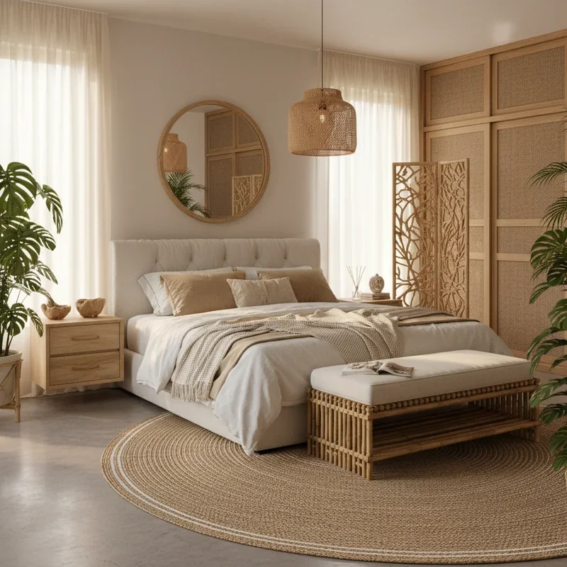 Ground your tropical bedroom with natural fiber rugs in jute, sisal, seagrass, or bamboo that add organic texture underfoot. Layer smaller patterned rugs over larger natural bases for added comfort and visual interest. Choose bound edges in complementary colors or leather for durability and finished appearance. Position rugs to define different zones: beside the bed, under seating areas, or in dressing spaces. The natural variations in fiber rugs add subtle pattern while maintaining neutral base that doesn't compete with tropical prints elsewhere. Consider round rugs for breaking up angular room geometry with organic shapes. These materials feel authentic to tropical locations while being sustainable choices that align with island conservation values. Natural fiber rugs age gracefully, developing character that enhances the lived-in vacation rental feel.