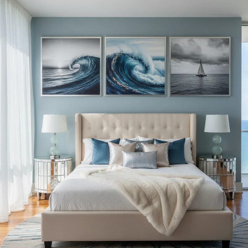 Decorate walls with ocean photography, tropical landscape paintings, or abstract art in sea-inspired colors. Choose oversized pieces that make statements or create gallery walls mixing various tropical scenes. Include underwater photography, sunset beach scenes, or aerial island views that transport you mentally to vacation destinations. Mix photography with painted pieces or prints for varied artistic expression within your tropical theme. Frame artwork in natural materials like bamboo, rattan, or weathered wood that complement the tropical aesthetic. Position art at eye level from your bed so you wake up to inspiring ocean views. Consider commissioning custom pieces from your actual vacation photos for personal connection to displayed imagery. This visual reminder of tropical paradises helps maintain that vacation mindset even during stressful weekdays.