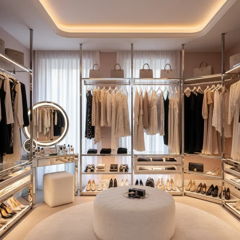 Your glam room isn't complete without a gorgeous wardrobe display that makes choosing outfits as enjoyable as applying makeup. Custom closet systems with glass doors or open concepts turn your clothing into decor. Organize by color for a boutique-like rainbow effect that's both beautiful and practical. Velvet hangers in coordinating colors maintain uniformity while protecting delicate fabrics. Built-in LED lighting illuminates your wardrobe, making everything visible and Instagram-worthy. Dedicated sections for handbags, shoes, and accessories with proper display shelving showcase your collection properly. Pull-out drawers with clear fronts keep smaller items organized and visible. A full-length mirror positioned strategically allows for outfit checks without leaving your glam zone. This integration of wardrobe and beauty space creates a complete dressing room experience, streamlining your entire getting-ready process while surrounding you with the things that make you feel fabulous.