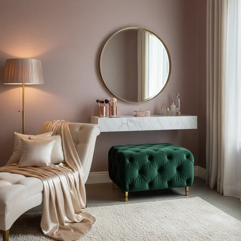Your color palette sets the entire mood for your glam room, and certain combinations just whisper luxury louder than others. Classic combinations like black, white, and gold create timeless sophistication that never goes out of style. Blush pink paired with rose gold feels feminine and fresh while maintaining elegance. Deep jewel tones like emerald, sapphire, or amethyst against neutral backgrounds add drama without overwhelming. Monochromatic schemes in varying shades of gray or beige create subtle sophistication that lets your colorful beauty products pop. Consider an accent wall in a bold color or metallic wallpaper to add interest without committing to full room color. Whatever palette you choose, maintain consistency through accessories, storage solutions, and textiles. The colors should make you feel confident and beautiful, creating a backdrop that enhances both your products and your daily transformation ritual.