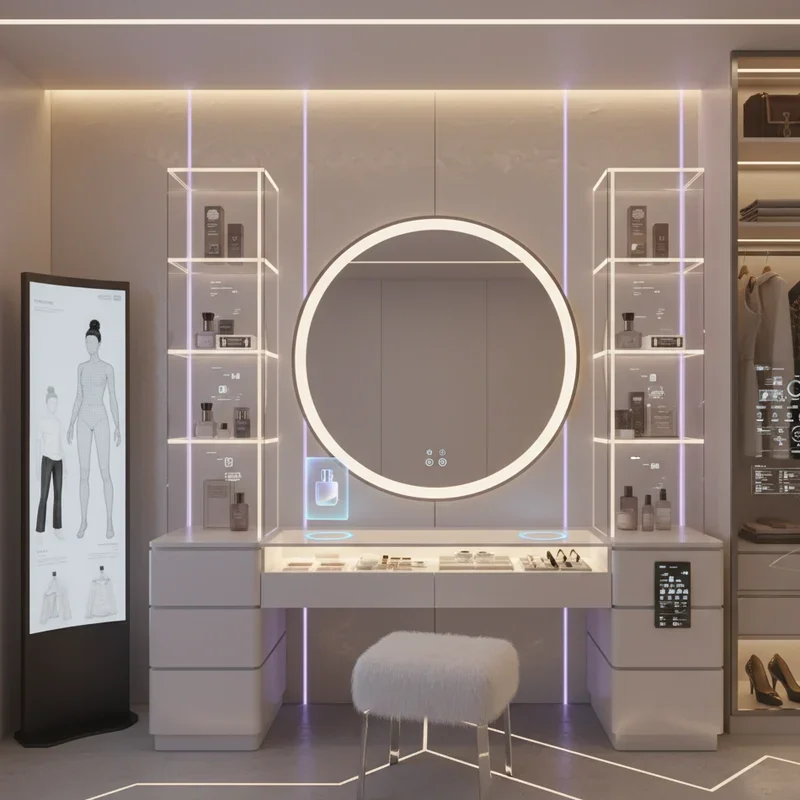 Bring your glam room into the future with smart technology that enhances both functionality and luxury. Smart mirrors with built-in lighting controls, bluetooth speakers, and even skincare analysis take your routine to the next level. Voice-controlled smart speakers let you play your getting-ready playlist hands-free or set timers for face masks. Smart lighting systems allow you to program different settings for morning, afternoon, and evening applications. A tablet mount near your vanity keeps tutorials accessible while you work. Wireless charging stations built into furniture keep devices powered without visible cords cluttering your beautiful surfaces. A mini fridge for skincare products adds that professional spa touch while keeping products at optimal temperatures. These tech additions prove that glamour and innovation go hand in hand, making your beauty routine more efficient while maintaining that luxurious feel you're after.