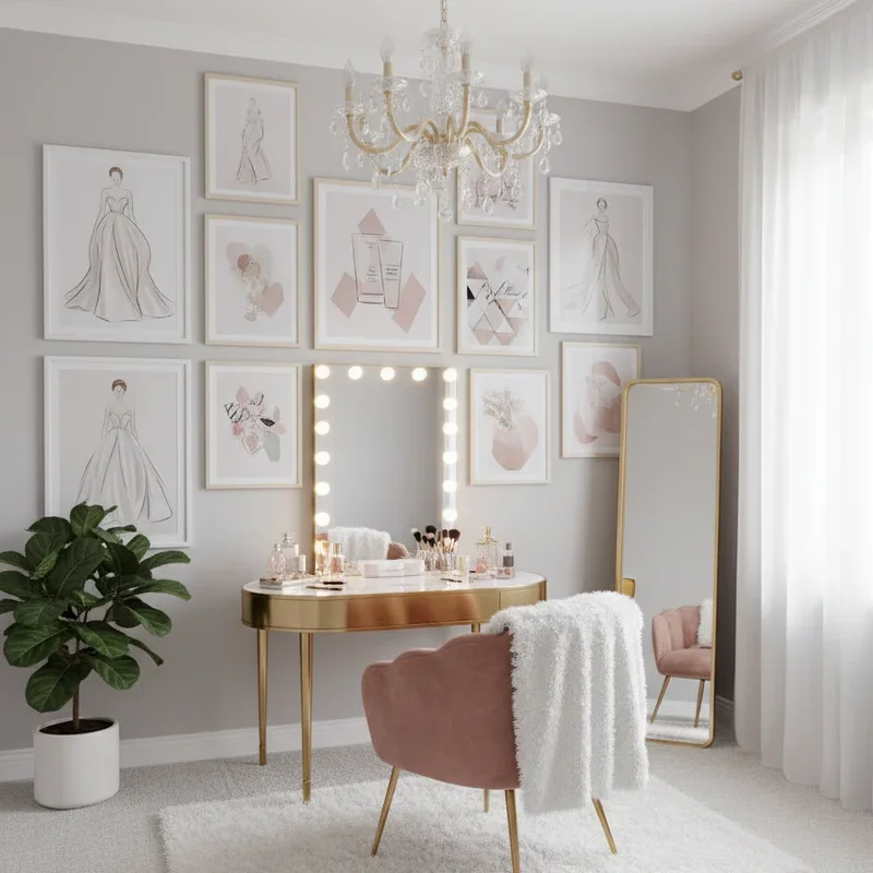 Transform blank walls into inspiring showcases with carefully curated gallery walls featuring fashion photography, beauty illustrations, or motivational quotes in gorgeous fonts. Mix vintage Vogue covers with modern fashion sketches for eclectic sophistication. Black and white photography creates timeless elegance, while colorful beauty campaigns add energy and inspiration. Frame everything in coordinating metallics or classic black frames for cohesion. Include mirrors within your gallery arrangement to add dimension and function. Personal photos from special events where you felt amazing remind you of your own glamorous moments. Arrange pieces asymmetrically for modern appeal, or create a perfect grid for classic style. Change artwork seasonally to keep your space feeling fresh and inspiring. This personalized gallery becomes your daily dose of beauty inspiration, surrounding you with images that make you excited about creating your own gorgeous looks while adding serious style to your walls.