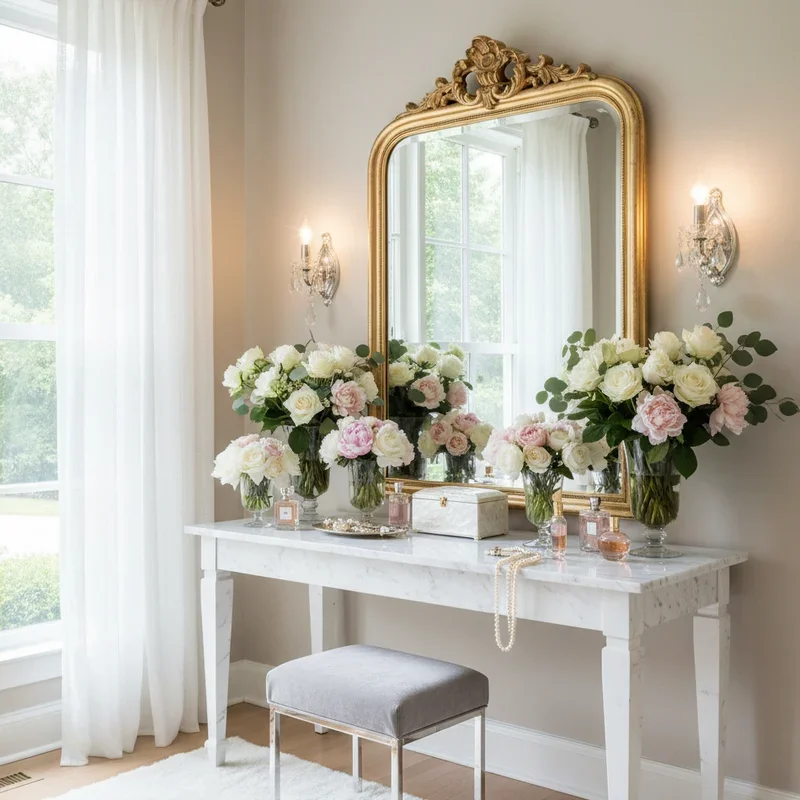 Nothing elevates a space quite like fresh flowers, adding life, fragrance, and that undeniable luxury factor to your glam room. Keep a vase of peonies, roses, or orchids on your vanity for instant elegance. If fresh flowers aren't sustainable, high-quality silk arrangements in beautiful vessels work wonderfully too. Decorative perfume bottles displayed on mirrored trays become functional art pieces. Crystal or glass decorative objects catch light and add sparkle without cluttering surfaces. A small decorative bowl for rings and everyday jewelry keeps essentials handy while looking purposeful. Scented candles in beautiful containers add ambiance and create a spa-like atmosphere during your beauty routine. These finishing touches are what separate a functional space from a truly glamorous retreat. They're the details that make you smile every time you enter your room, creating an environment that feels special and intentionally designed for beauty and self-care.