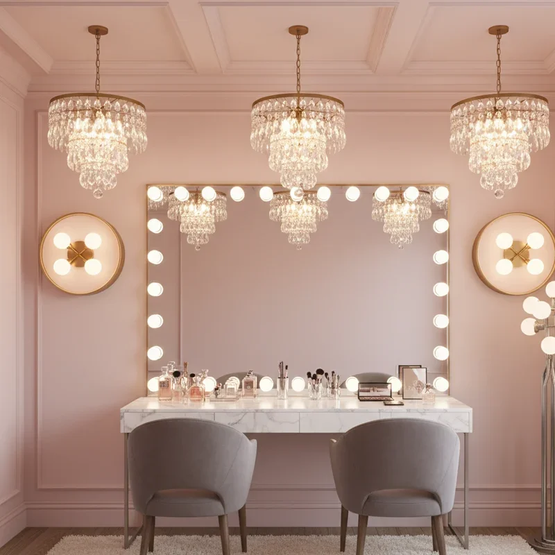 Lighting is the jewelry of your glam room, and a show-stopping chandelier or unique fixture can instantly elevate the entire space. Crystal chandeliers cast beautiful rainbow reflections while adding that old Hollywood glamour you're craving. If chandeliers aren't your style, consider modern geometric pendants in rose gold or brass finishes. Layer your lighting with table lamps featuring crystal bases or metallic shades for task lighting flexibility. Wall sconces flanking your mirror add symmetry and extra illumination for detailed work. Don't forget about ambient lighting! LED strips behind furniture or along shelving create a soft glow that makes everything look expensive. The secret is mixing different light sources at various heights to eliminate harsh shadows and create depth. Your lighting should be functional enough for precise makeup application yet atmospheric enough to make you feel like you're in a high-end salon.