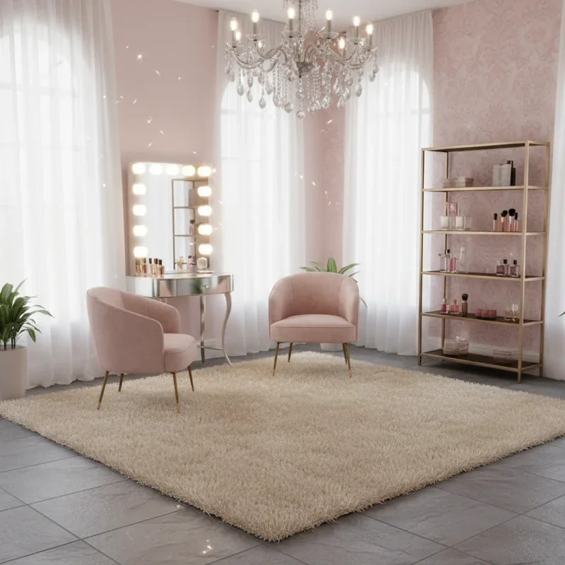 Your feet deserve the star treatment too! A plush area rug instantly warms up your glam room while adding texture and defining your beauty zone. Faux fur rugs in white or blush pink create cloud-like comfort underfoot, perfect for barefoot morning routines. If faux fur feels too bold, consider a high-pile shag rug in neutral tones that still delivers that luxurious feel. Vintage-inspired Persian rugs in jewel tones add unexpected sophistication while hiding any makeup spills. Layer smaller accent rugs for added dimension, perhaps a sheepskin beside your vanity chair. The rug should be large enough to anchor your vanity area but not so large it overwhelms the space. Consider materials that are both beautiful and practical, easy to clean when inevitable product spills occur. This foundation layer sets the tone for your entire room, making even simple spaces feel intentionally designed and incredibly inviting.