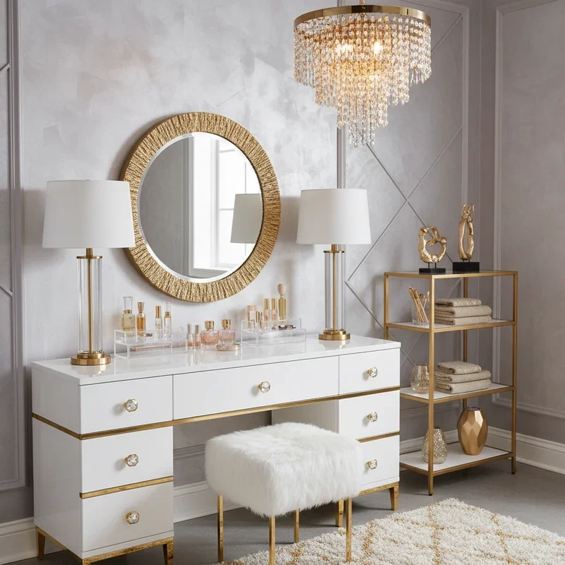 Metallics are the secret sauce that takes your glam room from pretty to absolutely stunning. Incorporate gold, rose gold, silver, or brass through hardware, picture frames, mirror edges, and decorative objects. Mix metals confidently; the key is maintaining balance rather than matching everything perfectly. A gold-framed mirror paired with rose gold drawer pulls and silver accessories creates sophisticated depth. Metallic wallpaper on an accent wall adds drama without overwhelming the space. Consider metallic furniture legs, lamp bases, or even a gilded trash can that makes mundane items feel special. These shimmering touches catch light beautifully, creating that expensive look regardless of your actual budget. Small details like metallic makeup brush holders, jewelry dishes, or perfume trays on mirrored surfaces amplify the glamour factor. Remember, metallics are like jewelry for your room; they should enhance, not overpower, your overall design.