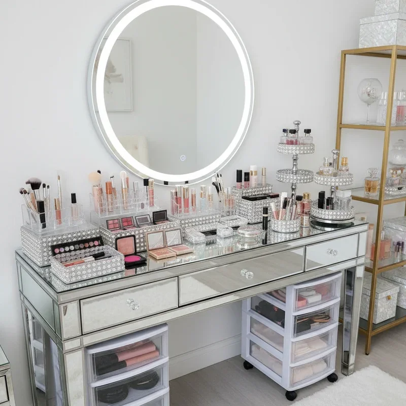 Mirrored furniture isn't just beautiful; it's strategic, making your glam room appear larger and brighter while amplifying that luxurious feel. A mirrored vanity desk reflects light throughout the room while hiding any clutter beneath its glamorous surface. Mirrored nightstands or side tables provide storage without visual weight, perfect for smaller spaces. Even mirror-backed shelving creates depth and showcases your products from multiple angles. These pieces work especially well with metallic accents, creating a cohesive shimmer throughout your space. Add mirrored trays on surfaces to corral perfumes and create designated zones for different products. The key is balance; too many mirrors can feel overwhelming, so mix them with matte textures and solid furniture pieces. These reflective surfaces bounce light around your room, making everything sparkle and ensuring you're always surrounded by brightness, essential for those early morning makeup sessions.