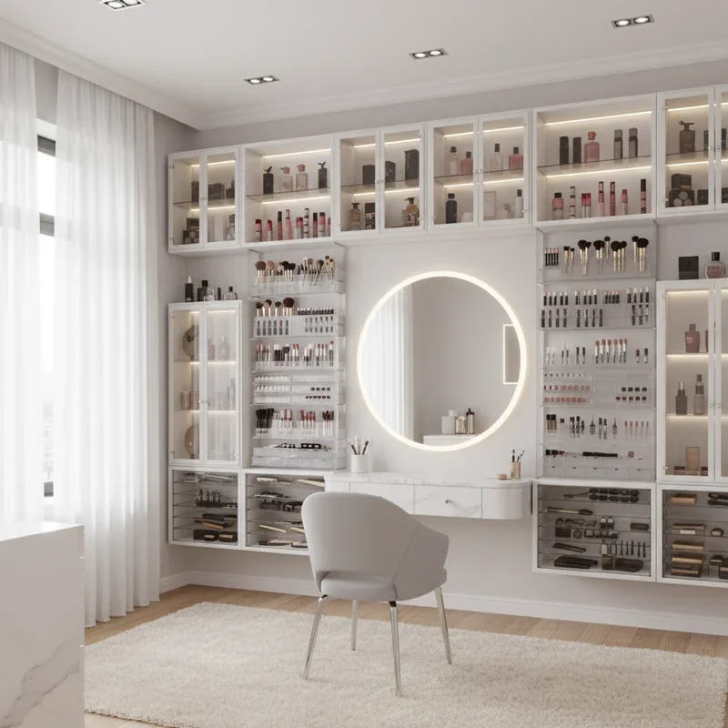 Maximize your space and create visual interest by taking your storage vertical with wall-mounted solutions that double as decor. Floating shelves in acrylic or glass keep your prettiest palettes and perfumes on display like a boutique. Install a pegboard painted in your room's accent color, then add hooks and small shelves for customizable organization. Shadow boxes can showcase special makeup collections or limited edition pieces like miniature art galleries. Magnetic strips hold metal tools like tweezers, scissors, and eyelash curlers within easy reach. Consider a wall-mounted vanity with fold-down mirror and storage compartments for small spaces. These vertical solutions free up valuable counter space while creating an organized, professional atmosphere. Arrange products by color for a rainbow effect, or group by category for practical accessibility. The wall becomes both functional and beautiful, turning your beauty routine into an interactive experience with your carefully curated display.
