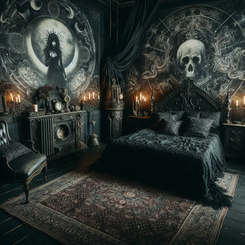 Personalize your Gothic bedroom with dark imagery and Gothic artwork that reflects your personal style and interests. Whether it's macabre portraits, eerie landscapes, or intricate illustrations inspired by Gothic literature, such artwork adds depth and character to your space, making it truly unique. These pieces serve as captivating focal points, sparking intrigue and conversation while enhancing the overall ambiance of your room. Whether displayed on walls, shelves, or mantels, Gothic artwork infuses your bedroom with a sense of mystery and allure, inviting you to explore the darker realms of art and imagination within the confines of your own sanctuary.