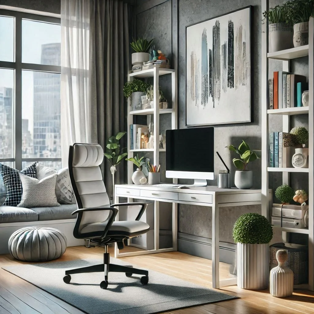 Create a functional yet stylish study space by pairing white shelves with a gray desk chair. White shelves offer ample storage and display options, keeping your workspace organized and visually clean while reflecting light to make the room feel more open and airy. The gray desk chair adds a modern touch and provides comfortable support for long study or work sessions, blending seamlessly with the white shelves for a cohesive look. To enhance the functionality and ambiance, incorporate task lighting such as a sleek desk lamp or an adjustable floor lamp, which not only illuminates your work area but also adds a cozy, inviting feel. Additionally, personalize the space with decorative elements like framed artwork, small plants, or stylish desk accessories to make it uniquely yours.