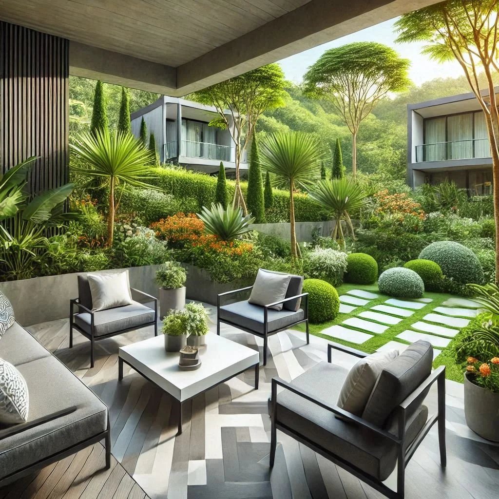 Create a chic and inviting outdoor space by pairing gray seating with crisp white cushions. This combination offers a modern and sophisticated look, blending neutral tones that are both stylish and versatile. The gray furniture provides a sturdy and elegant foundation, while the white cushions add a touch of brightness and comfort, making the area feel fresh and welcoming. To enhance the ambiance, accessorize with string lights or lanterns, which cast a warm and enchanting glow during the evening hours. These lighting elements not only provide functional illumination but also create a magical atmosphere perfect for relaxing, entertaining, or enjoying quiet moments outdoors. Additionally, consider adding decorative throw pillows, outdoor rugs, and potted plants to further personalize the space and add layers of texture and color.
