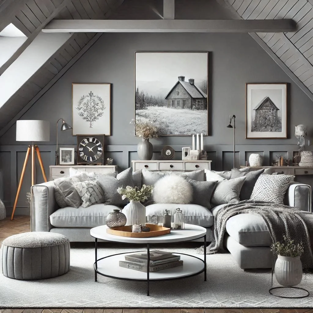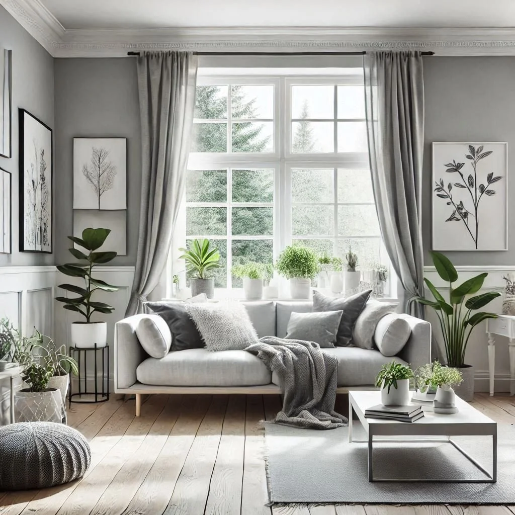 Create a stylish and inviting space by combining clean lines, light gray furniture, and white walls, embodying the essence of Scandinavian design. Start with sleek, minimalist furniture in soft gray tones, which provides a neutral and versatile base that promotes a sense of calm and order. The white walls enhance the room’s brightness, making it feel spacious and airy while serving as a perfect backdrop for subtle decor accents. To introduce warmth and texture, add a plush area rug that anchors the seating area and offers comfort underfoot. Incorporate wooden elements, such as natural wood coffee tables, shelving, or light-toned wooden flooring, to infuse the room with the signature Scandinavian warmth and organic feel. These wooden accents not only add visual interest but also create a cozy and welcoming atmosphere.