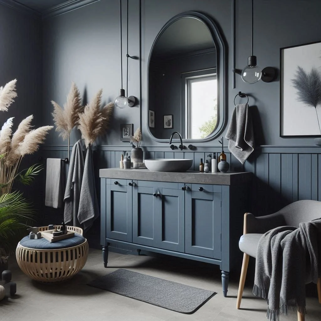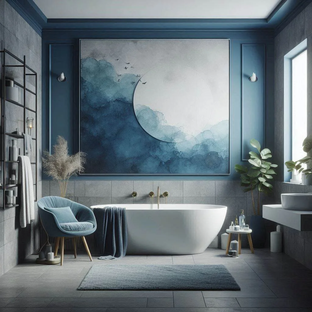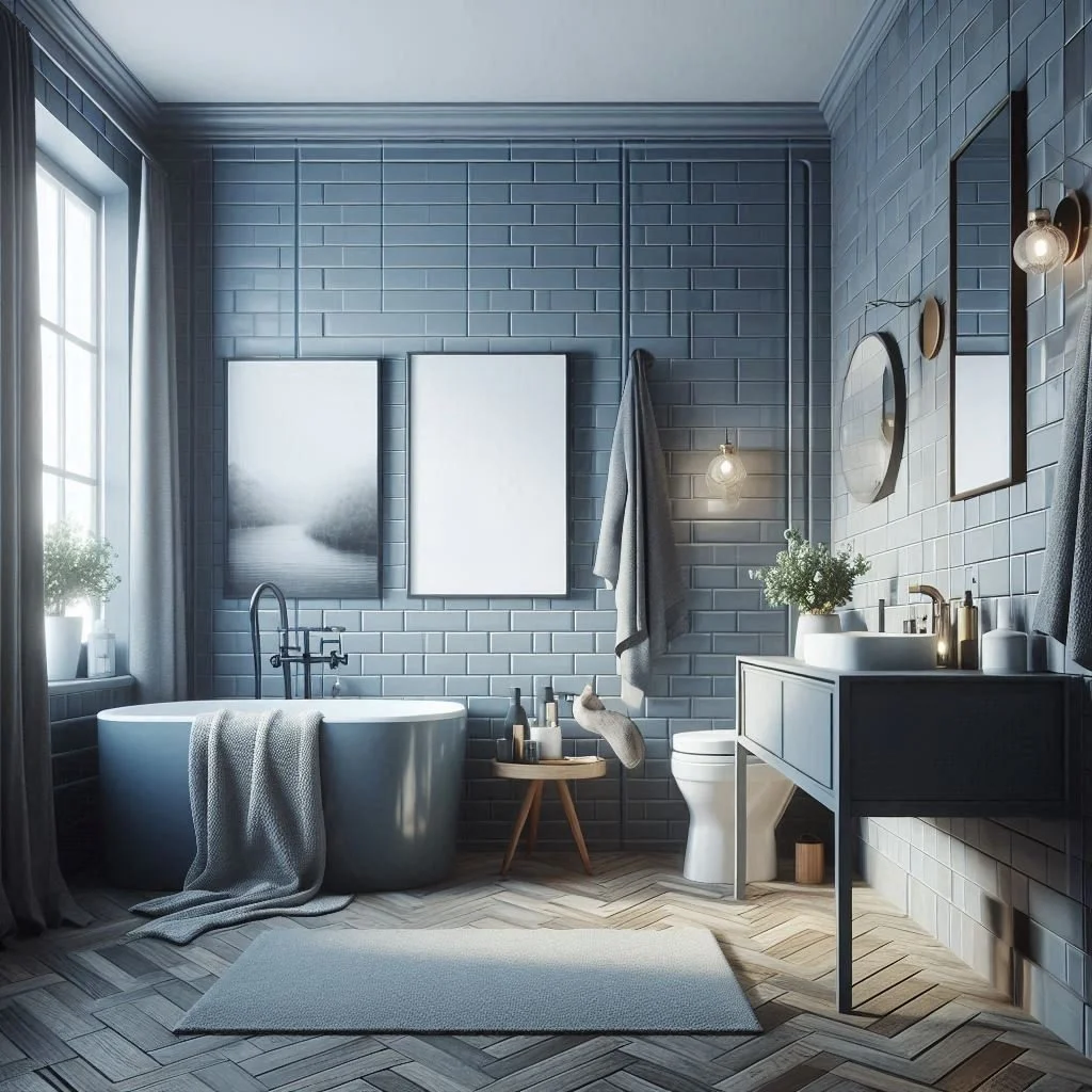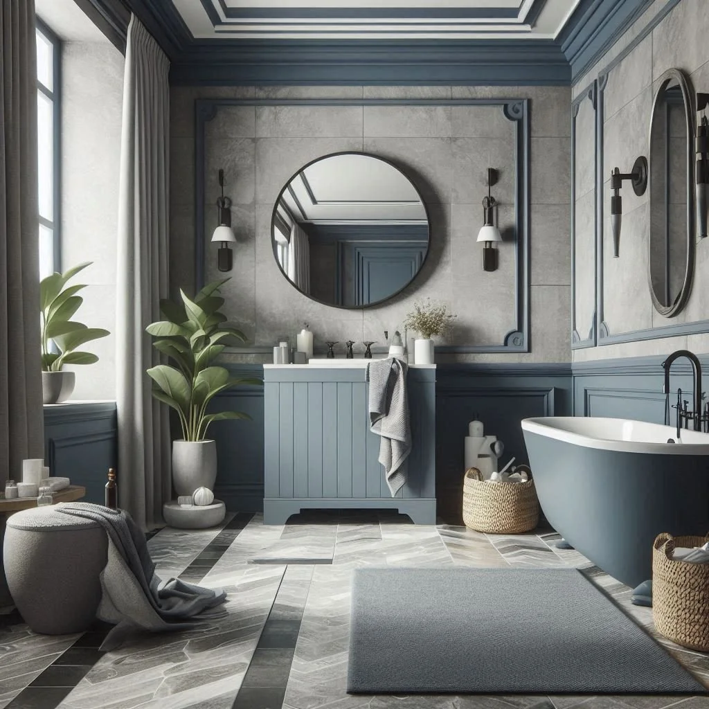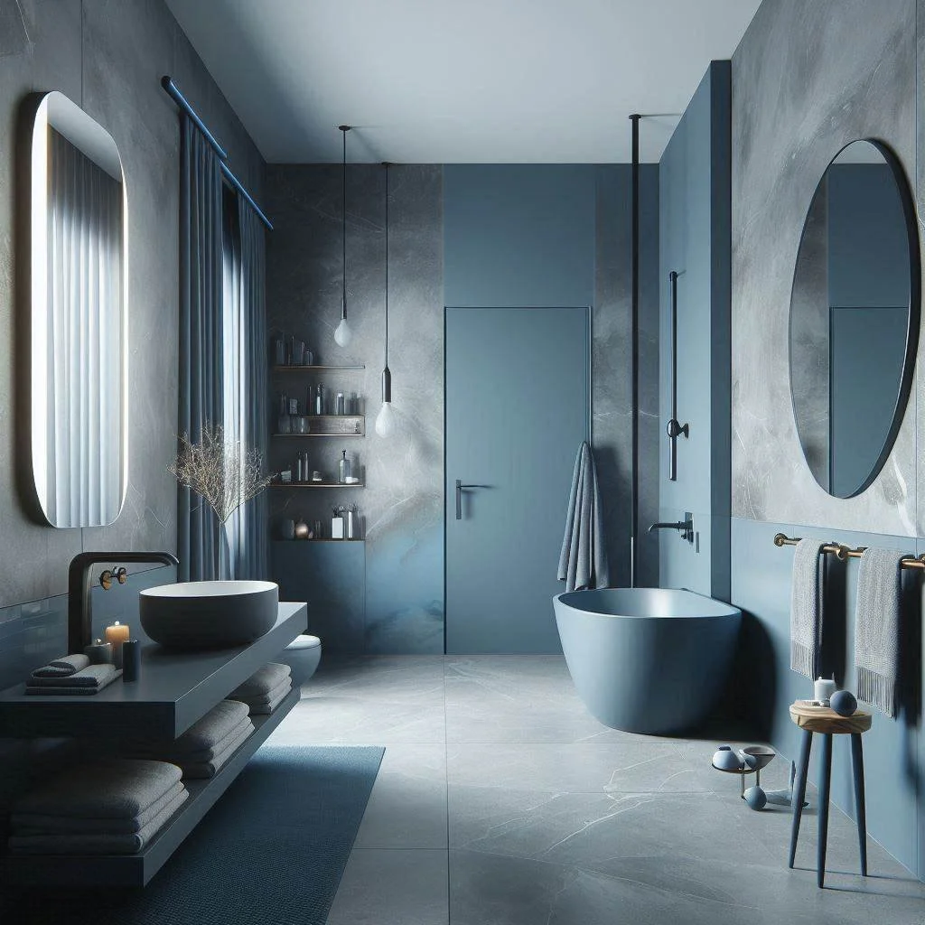 3. What type of blue works best with grey in a bathroom setting?