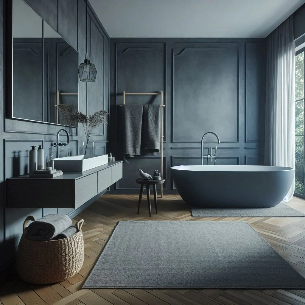 A deep blue bathtub is a bold and captivating design choice, making it the centerpiece of your bathroom. When paired with soft grey walls, the bathtub becomes a striking focal point, with the neutral grey providing the perfect backdrop to let the rich blue color truly stand out. This contrast creates a sophisticated and serene atmosphere, balancing vibrant color with calm, understated tones. The result is a harmonious and stylish environment, ideal for unwinding and enjoying a relaxing soak after a long day. This combination of deep blue and grey adds both elegance and tranquility to your bathroom, making it a beautiful retreat.