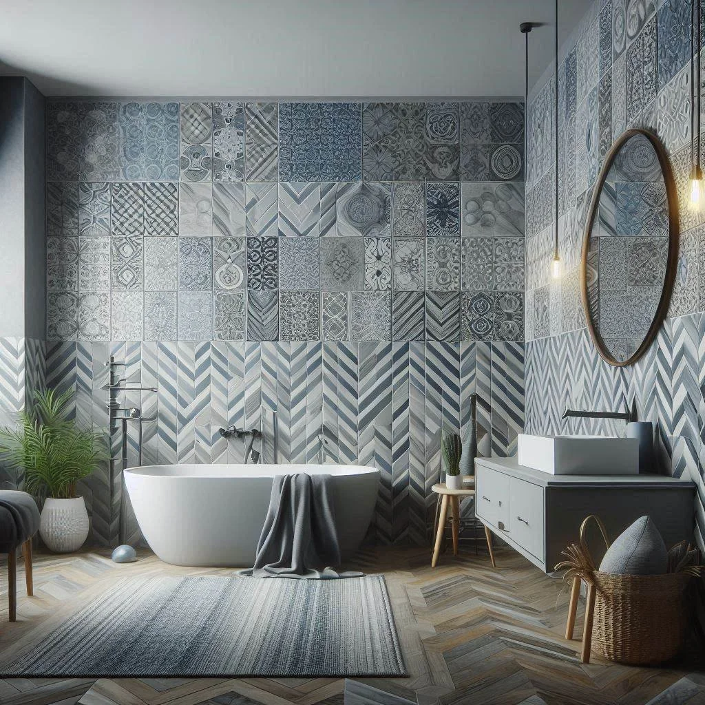 4. Can I mix patterns and textures in a grey and blue bathroom?