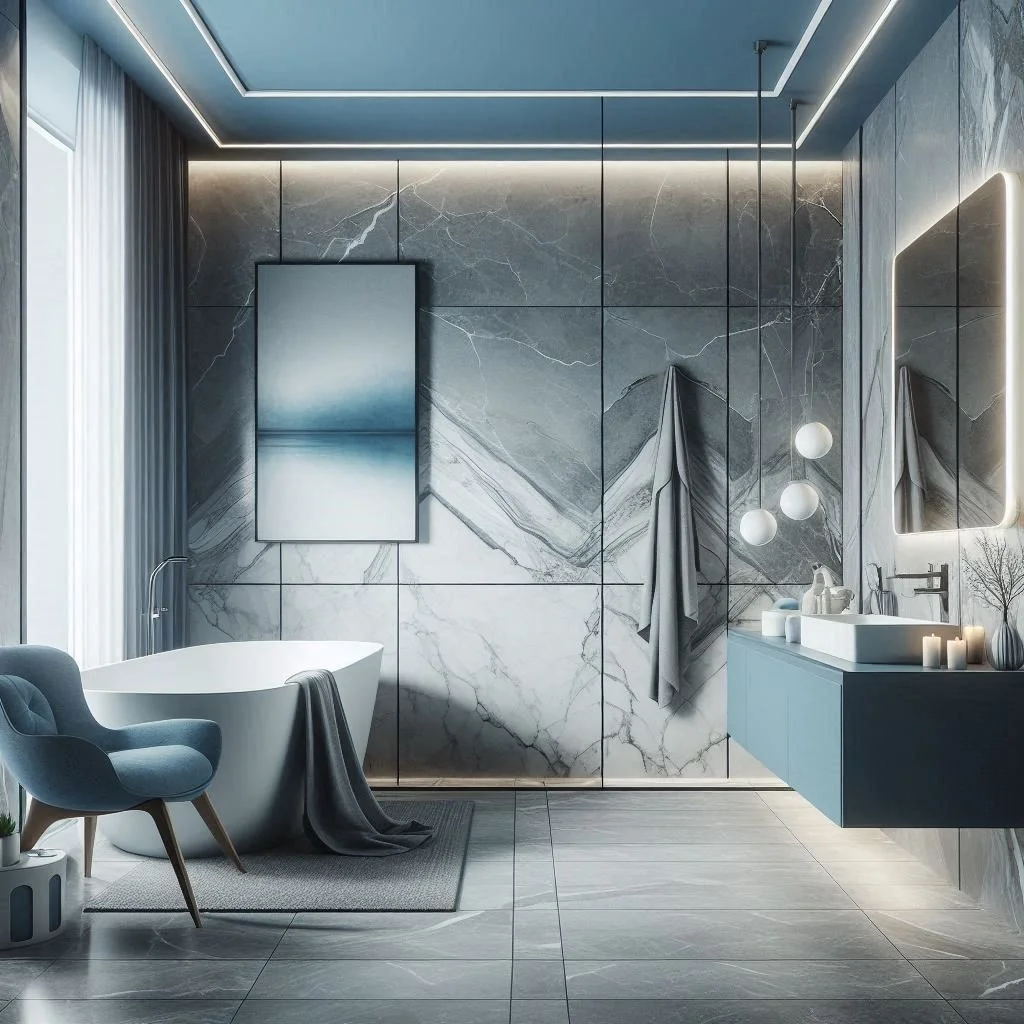 4. Blue Accent Wall Against Grey Tiles