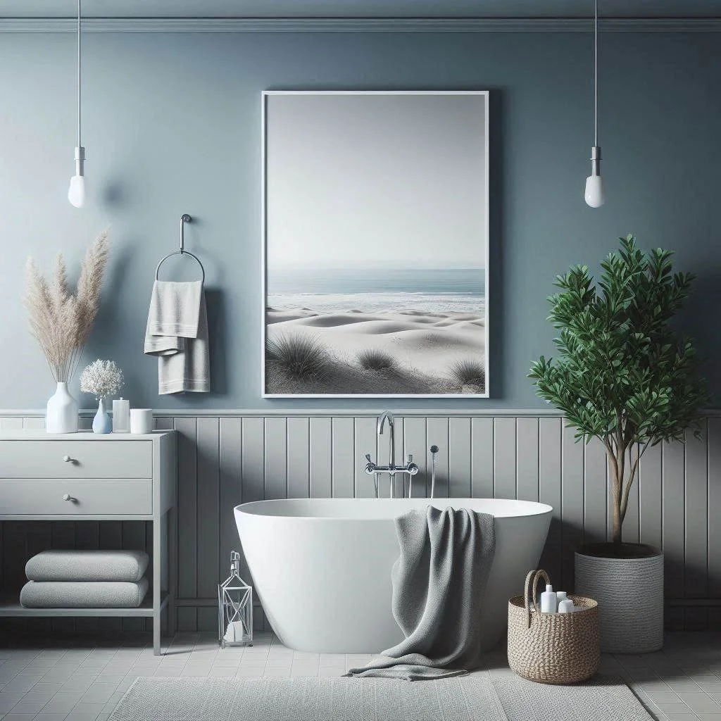Soft grey walls are an ideal starting point for designing a relaxing bathroom. The light, neutral tone creates a serene backdrop that enhances the sense of calm and space. To infuse personality into the room, introduce bold blue accents through items like bath towels, rugs, or a stylish shower curtain. This combination balances understated elegance with vibrant pops of color, creating a modern and tranquil retreat. The grey walls offer a soothing, minimalist foundation, while the blue accents add a touch of visual interest and freshness. This approach ensures a harmonious blend of subtle sophistication and lively charm, making the bathroom both inviting and visually appealing.