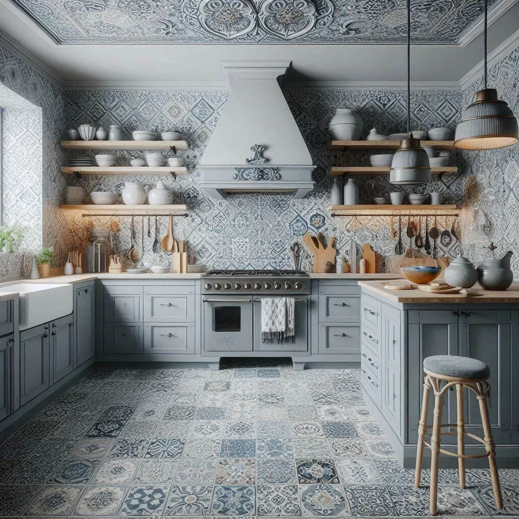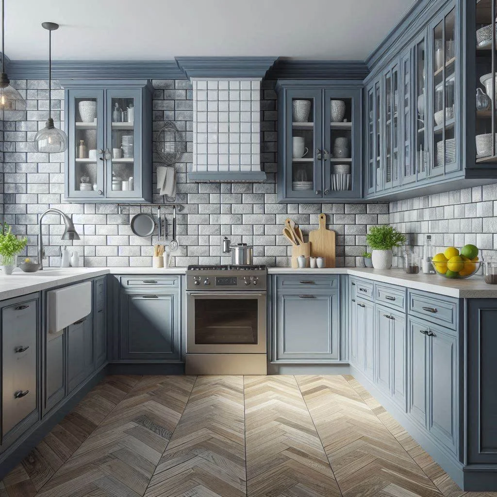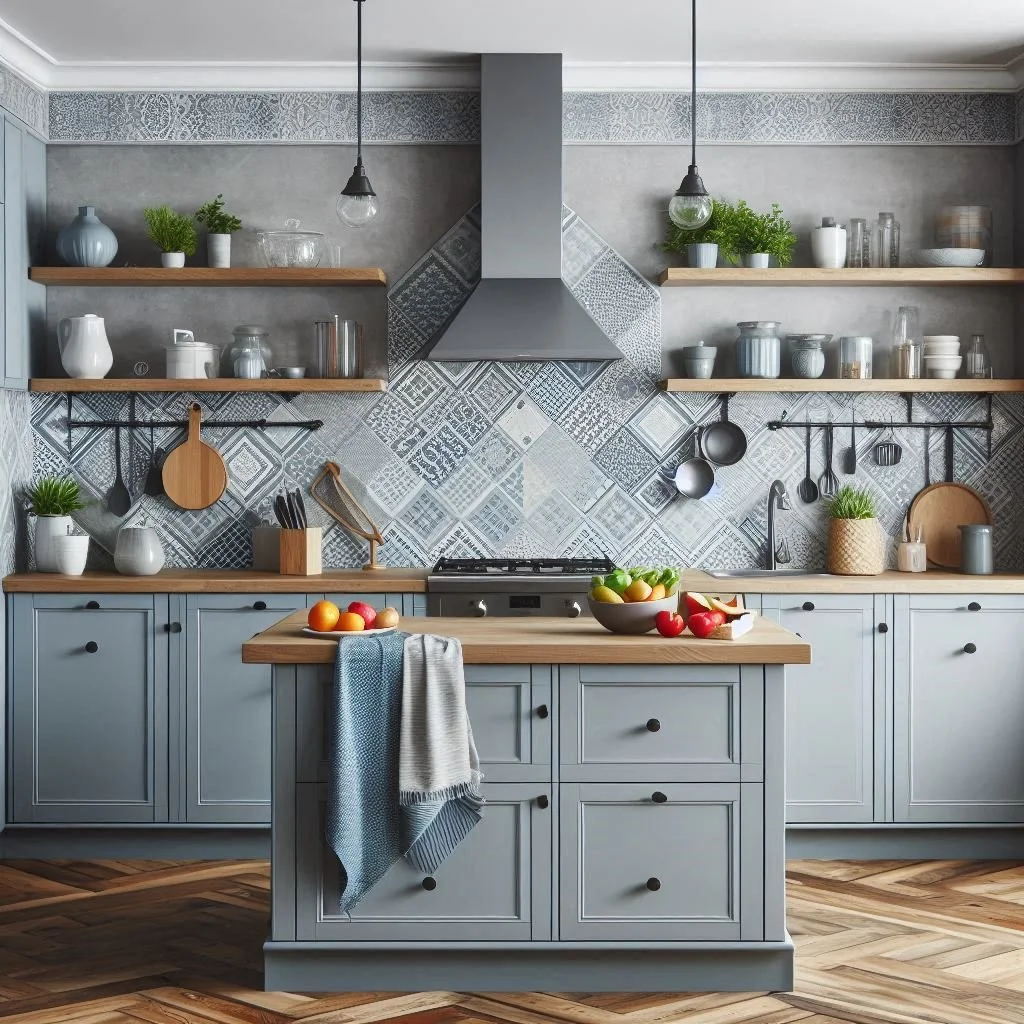 Incorporating both blue and grey through patterned tiles is a fun and creative way to add personality to your kitchen. These tiles can be used as a backsplash, floor tiles, or even as an accent wall, bringing a dynamic and visually captivating element to the space. The combination of blue and grey in intricate patterns adds depth and flair without overwhelming the overall design, creating a balanced look that’s both stylish and engaging. This approach allows you to infuse the kitchen with character while maintaining a cohesive color palette. Whether you prefer subtle geometric shapes or bold, artistic patterns, blue and grey tiles offer a versatile and striking way to enhance your kitchen’s aesthetic.
