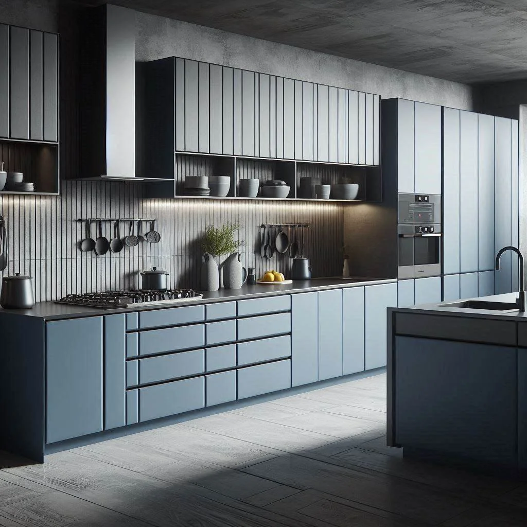 Add contrast and texture to your kitchen by combining a matte grey finish with glossy blue details. The matte grey cabinets provide a calm, understated base, offering a soft, muted look that anchors the space. In contrast, the glossy blue elements—whether in the form of a backsplash, handles, or appliances—bring a sleek, polished finish that adds a vibrant and modern touch. This combination creates a balanced design that feels both sophisticated and dynamic. The interplay between the matte and glossy textures introduces layers of visual interest, elevating the overall aesthetic while maintaining a sense of harmony. This approach is perfect for those who want to add subtle elegance with a hint of boldness to their kitchen design.