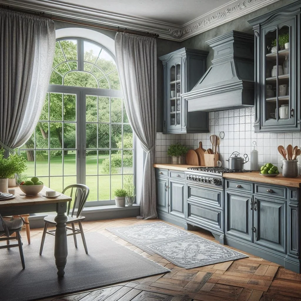 For a cozy, rustic look, embrace a grey and blue farmhouse-style kitchen. Grey shaker cabinets provide a classic, understated foundation, while a blue farmhouse sink or island adds a charming pop of color. This combination of hues creates a welcoming and balanced design that feels both modern and timeless. To enhance the farmhouse vibe, incorporate natural wood elements like exposed beams, open shelving, or a butcher block countertop, which bring warmth and texture to the space. The blend of grey, blue, and natural wood creates an inviting atmosphere, perfect for gathering and cooking, while maintaining the rustic elegance that defines a farmhouse-style kitchen. This look effortlessly combines comfort with style, making your kitchen feel like a cozy retreat.