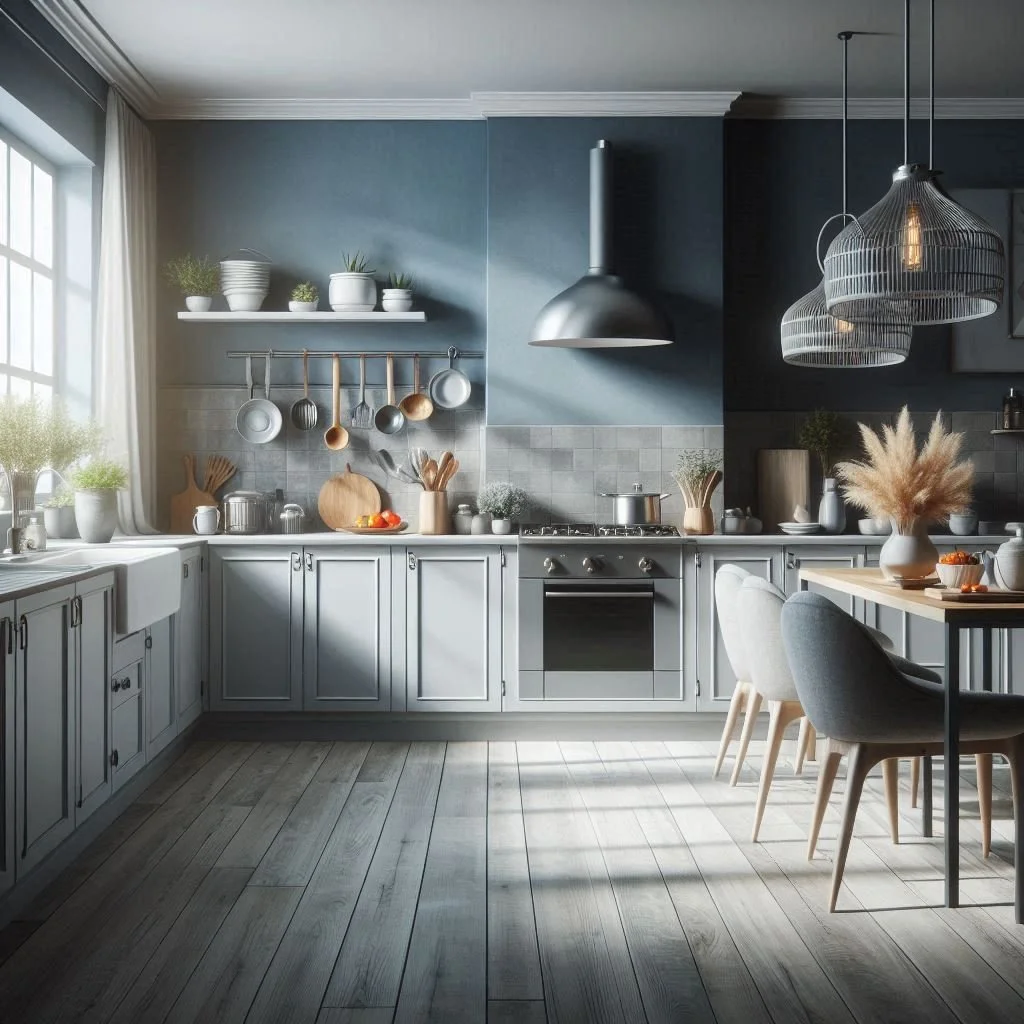 Consider installing grey floors to balance vibrant blue walls in your kitchen, creating a harmonious and stylish space. The neutral grey flooring provides a grounding foundation, offering a subtle yet sophisticated backdrop that enhances the room's overall design. Meanwhile, the blue walls inject a pop of color that adds energy and vibrancy, creating a bold yet balanced contrast. This combination works beautifully in both modern and traditional kitchens, as the grey tones bring calm and stability, while the blue offers a refreshing, lively touch. Together, they create a dynamic and cohesive aesthetic, making the kitchen feel both welcoming and visually engaging without being overwhelming.