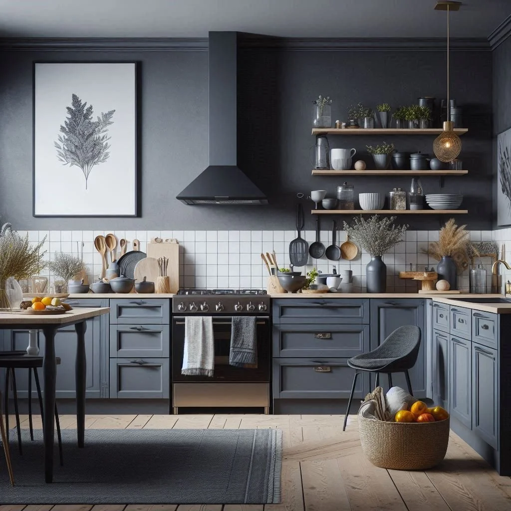 For a bold and dramatic look, combine navy blue and charcoal grey to create a kitchen that exudes luxury and depth. Navy blue cabinetry offers a rich, striking visual, while charcoal grey countertops or walls provide a perfect counterbalance, enhancing the moody, sophisticated ambiance. This dark, layered color palette brings a modern edge to your space, with the deep hues adding warmth and richness without feeling overwhelming. The combination of navy blue and charcoal grey creates a sleek, elegant environment that feels both refined and inviting, perfect for those looking to make a stylish statement in their kitchen. This palette works beautifully in contemporary designs, adding a sense of depth and high-end appeal.