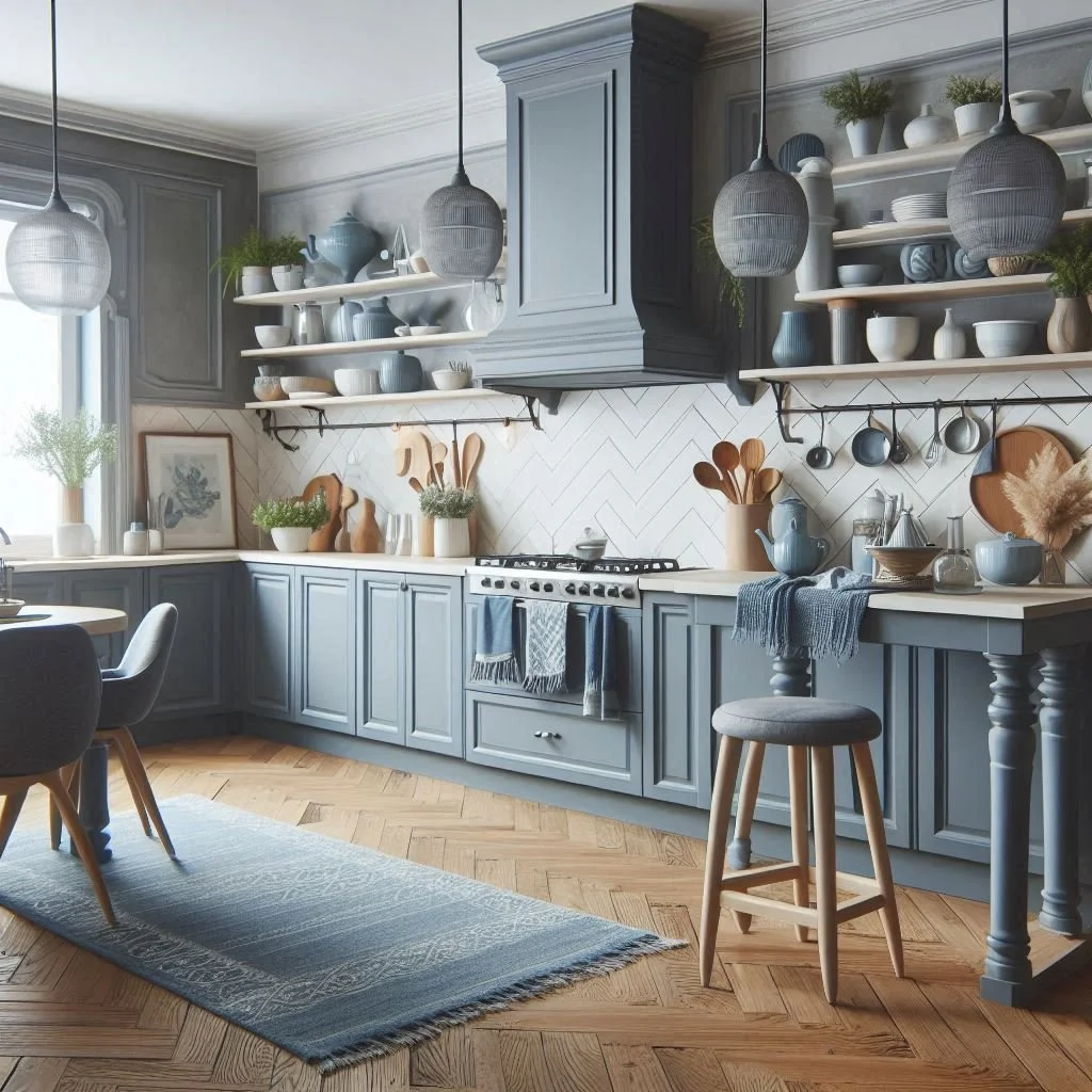 If you love the idea of open shelving, consider incorporating grey and blue accents for a stylish, cohesive design. Grey shelves provide a sleek, neutral backdrop, while blue dishes, glassware, or decorative items add a pop of color that complements the overall aesthetic. This combination creates a balanced and visually appealing display, perfect for those who want to highlight beautiful kitchen pieces. Open shelving not only adds functional storage but also offers a chance to infuse your personality into the space by showcasing your favorite kitchen items in complementary colors. The mix of grey and blue brings a modern yet inviting vibe, making your kitchen both practical and aesthetically pleasing.