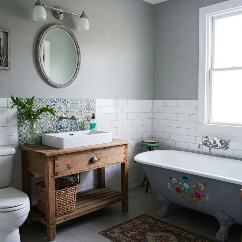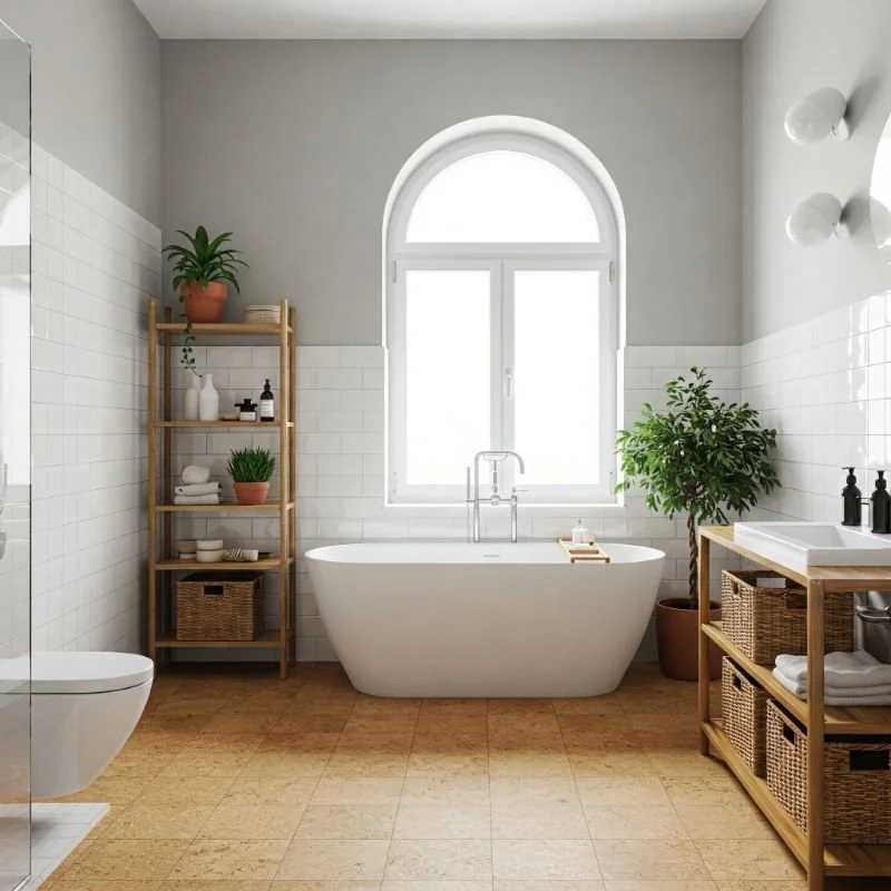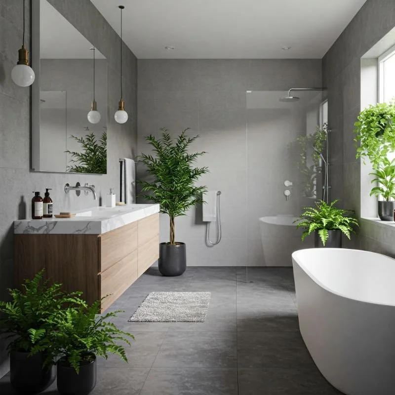Q2: How can I add warmth to a predominantly grey and white bathroom?