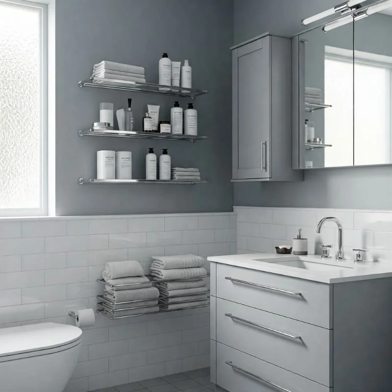 In any modern bathroom, clever storage solutions are vital to maintaining a clutter-free and serene environment. Imagine built-in cabinets, floating shelves, or recessed niches seamlessly integrated into your grey and white design. These storage options allow you to keep toiletries, towels, and decorative accents neatly tucked away while preserving the room’s sleek appearance. The focus is on combining form and function—every piece of furniture is designed to offer maximum utility without sacrificing style. It’s like having a personal organizer hidden in plain sight, ensuring that every item has its designated place. By opting for minimalist storage solutions that blend with your overall color scheme, you create a bathroom that feels spacious, organized, and effortlessly chic. This thoughtful approach ensures your space remains both beautiful and practical.
