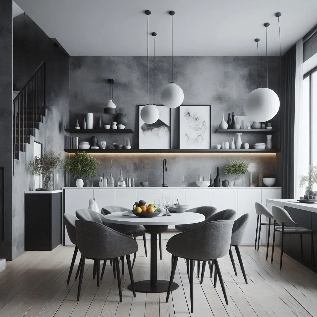 If your kitchen includes a dining area, a minimalist design can beautifully complement the kitchen’s sleek aesthetic. Opt for a simple dining table in a light wood or black finish, which adds warmth without overwhelming the space. Pair the table with modern, streamlined chairs that reflect the clean lines of your kitchen. This minimalist approach keeps the dining area open and uncluttered, making the space feel more expansive. To enhance the overall ambiance, incorporate subtle decor like a centerpiece or pendant lighting that echoes the kitchen’s design. By keeping the focus on simplicity, you allow the kitchen's bold elements to shine while creating a harmonious and functional dining area.