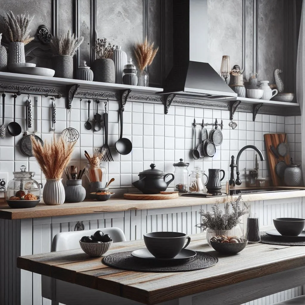 Incorporating white open shelving is a fantastic way to brighten up your kitchen while adding functionality and style. Open shelves allow you to showcase your favorite dishware, plants, and decorative items, infusing the space with personality and charm. By strategically styling the shelves with a mix of black, grey, and white items, you can create a cohesive and harmonious look that ties the color scheme together. This arrangement not only keeps the kitchen feeling airy and inviting but also makes it easy to access your everyday essentials. Consider adding some decorative baskets or books for texture, and don’t shy away from layering items to create depth and visual interest. With open shelving, your kitchen becomes a reflection of your style, making cooking and entertaining more enjoyable.
