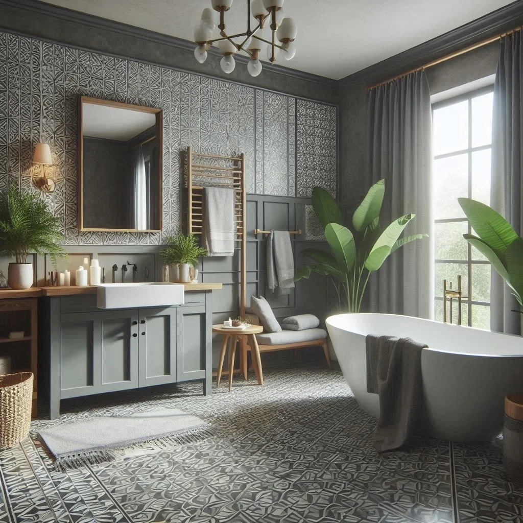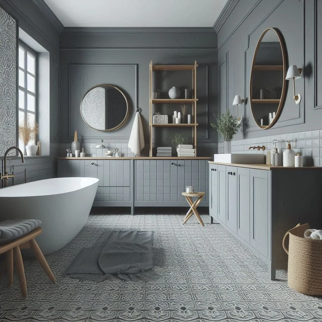 Patterned floor tiles are an excellent choice for adding a bold statement to a modern farmhouse bathroom. Opting for geometric patterns can infuse a contemporary twist into the traditional farmhouse design, making the space both modern and inviting. For a dash of nostalgia and a more classic appeal, consider vintage-inspired tiles that feature floral or encaustic patterns. These designs add an elegant touch and a sense of timelessness to the room. To maintain a cohesive look that complements the grey color palette prevalent in modern farmhouse styles, choose tiles in neutral tones. This approach ensures that the bold patterns enhance rather than overwhelm the bathroom’s overall aesthetic, seamlessly blending traditional charm with modern sophistication.