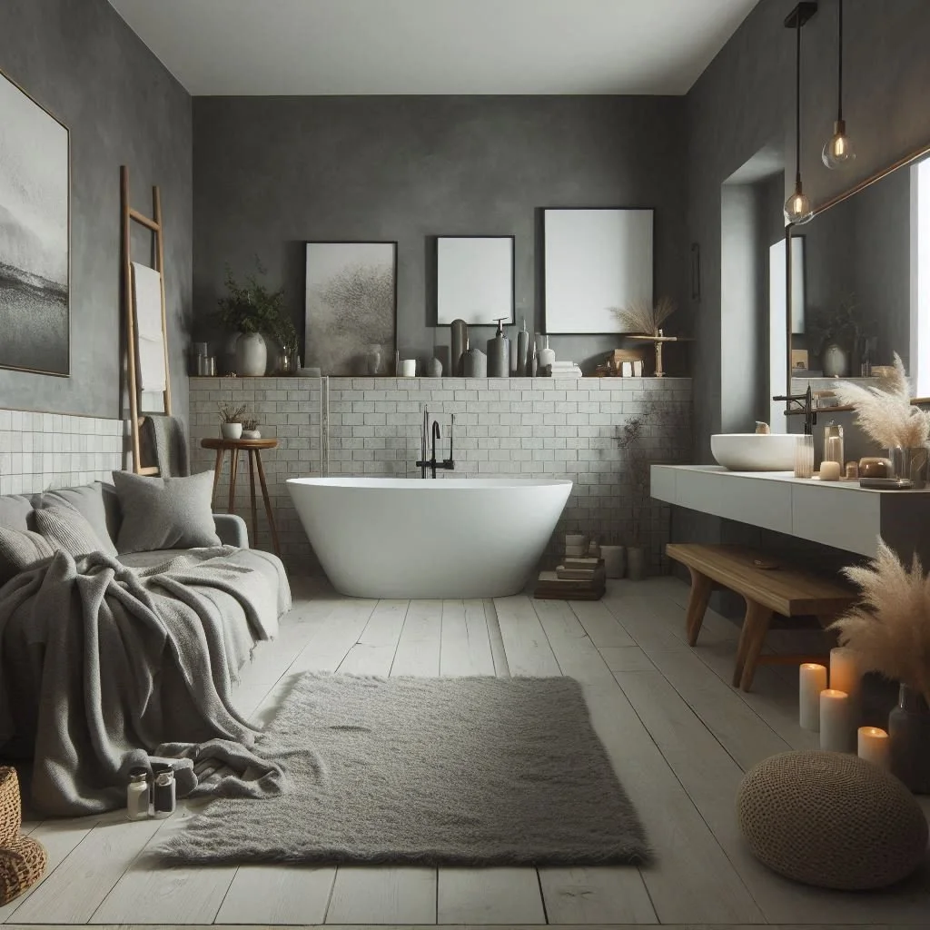 Use light grey and white to create an airy and spacious feel. Incorporate glass elements, like shower doors and shelving, to enhance the sense of openness.